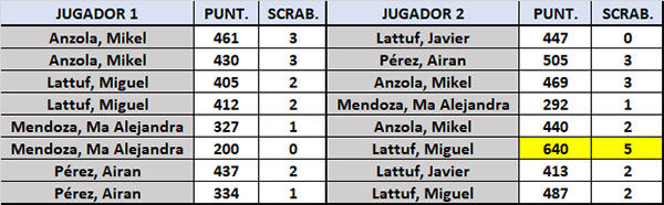🏆🏅Premios: Primer, segundo y tercer lugar; partida más alta, jugada más valiosa y mayor cantidad de scrabbles. Palabra más alta con la letra V.